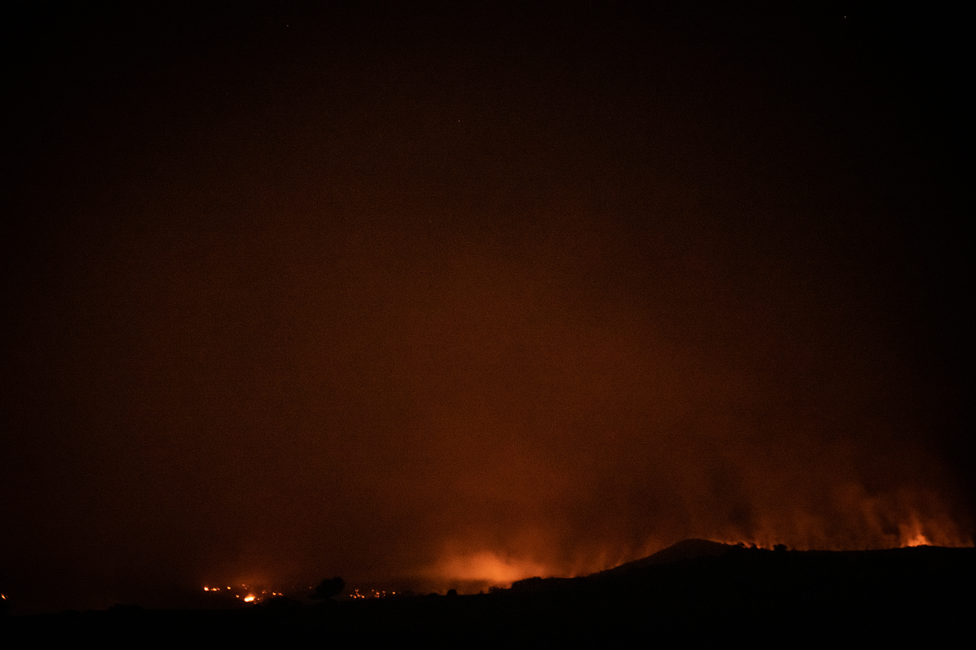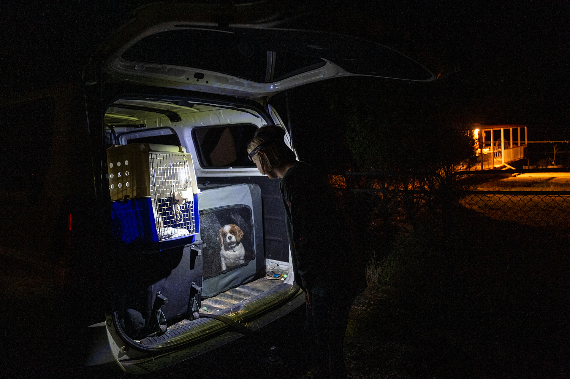 A family and their rescued animals during a late night evacuation away from the bushfires near Lancefield. As fires continued to move through the state of central Victoria, thousands of people waited on alert to mobilize and leave their homes with their families, animals, and possessions at a moment's notice. Georgie Katherine and Ward Young, who own a property that houses many of their rescued animals, were alerted to leave, and spent several hours relocating horses, cats, and other animals to a safer property nearby.