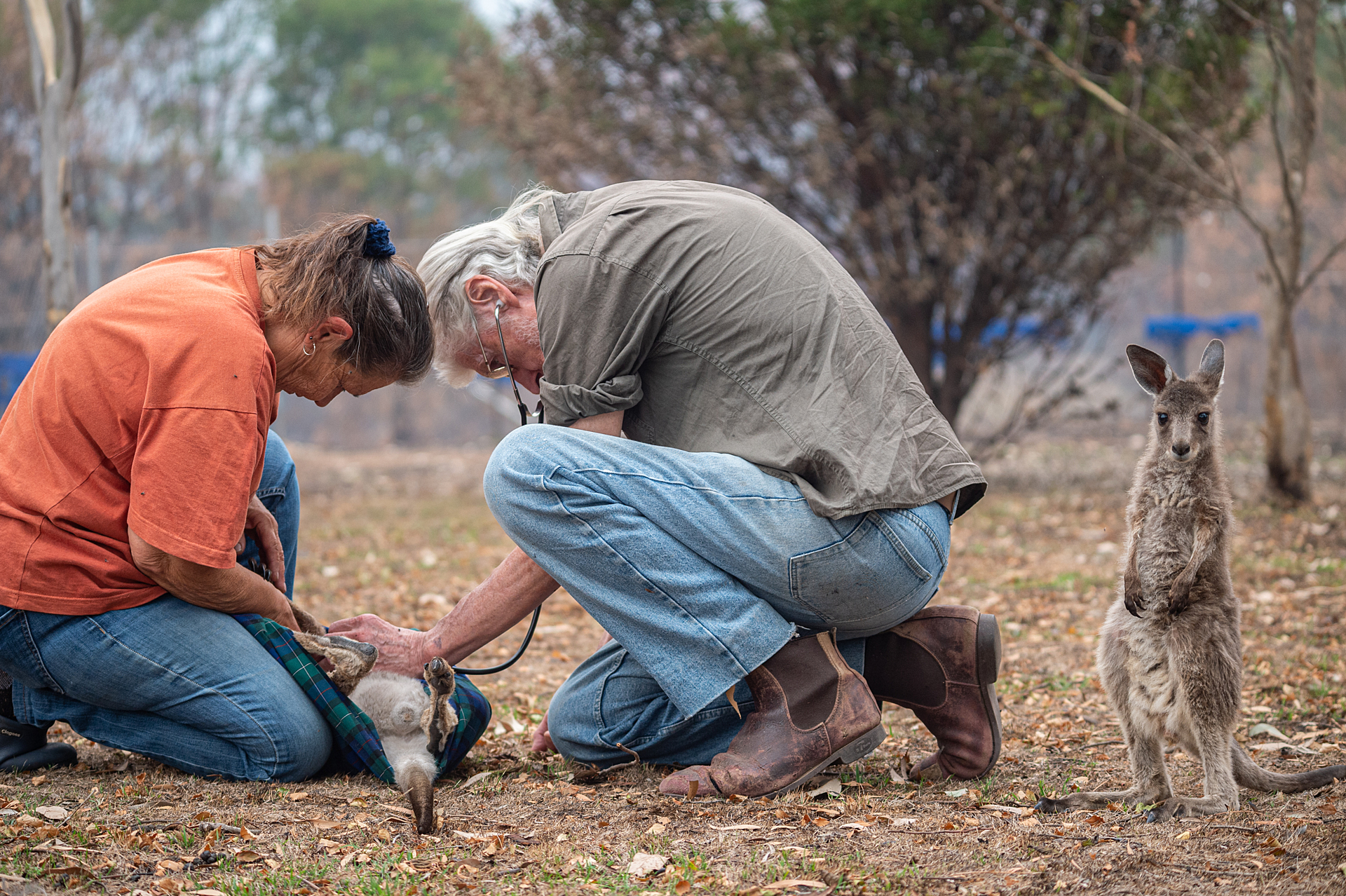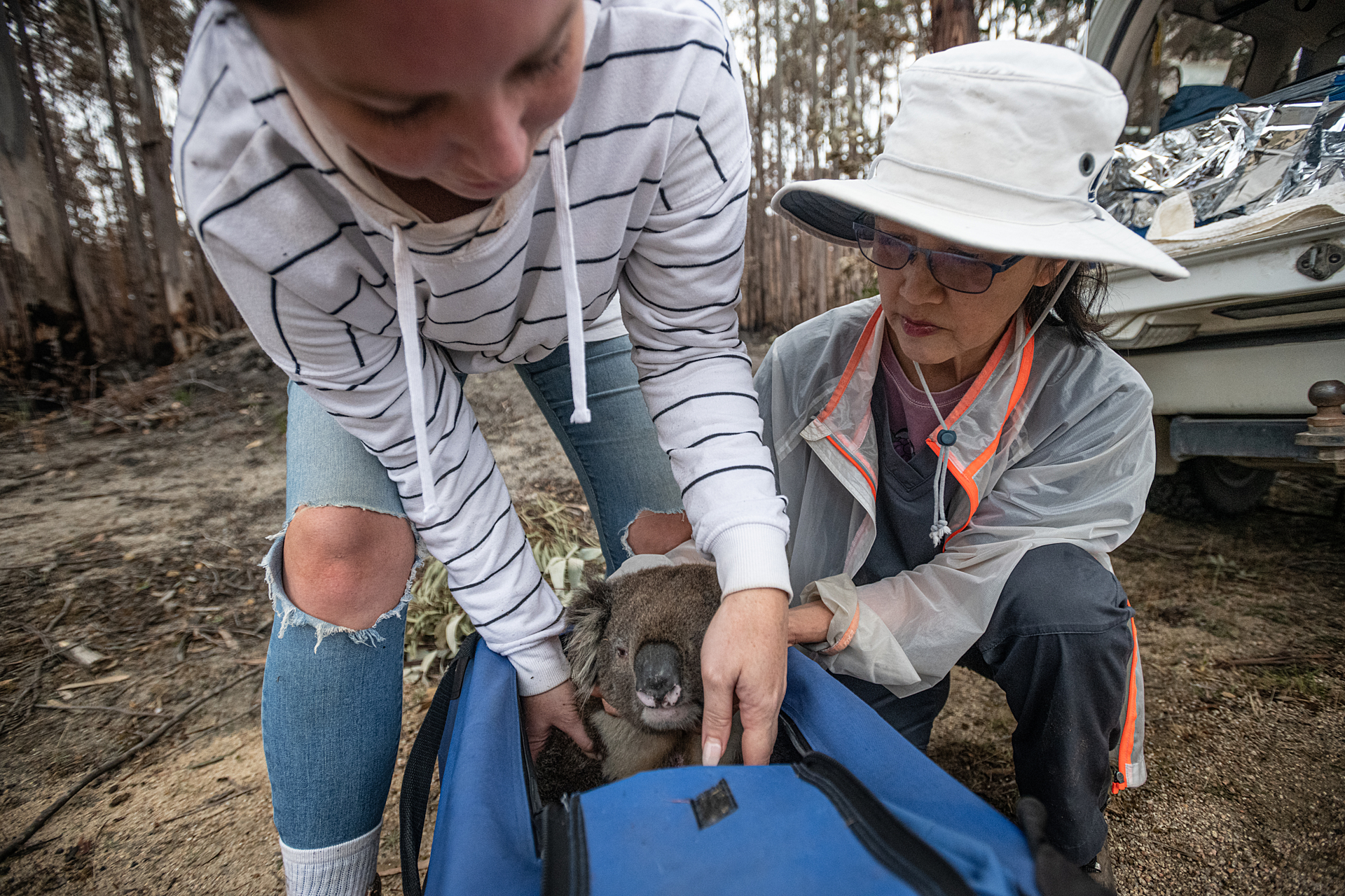 The NGO Vets for Compassion made their way past blockades and red tape to work in Mallacoota, Victoria, which had been severely affected by the bushfires. Founders Dr. Elaine Ong and Dr. Chris Barton (pictured) worked long hours in the burn zones to find and rescue wild animals, with a focus on finding injured, dehydrated and starving koalas who needed immediate care. Animals were found, sedated, and brought to triage. Animals whose injuries were beyond repair were humanely euthanized.