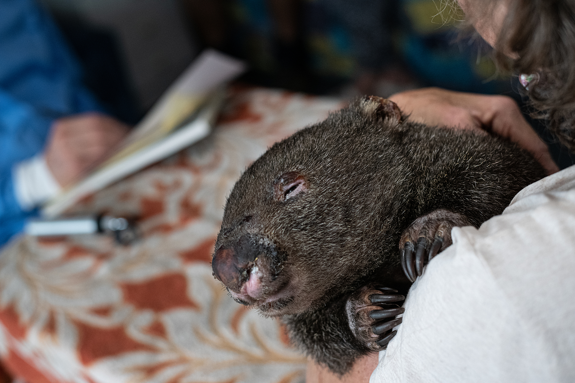 A sub-adult wombat is treated for a brain injury and various wounds at Southern Cross Wildlife Care. He was most likely hurt when fleeing the fires. Braidwood, New South Wales, Australia.