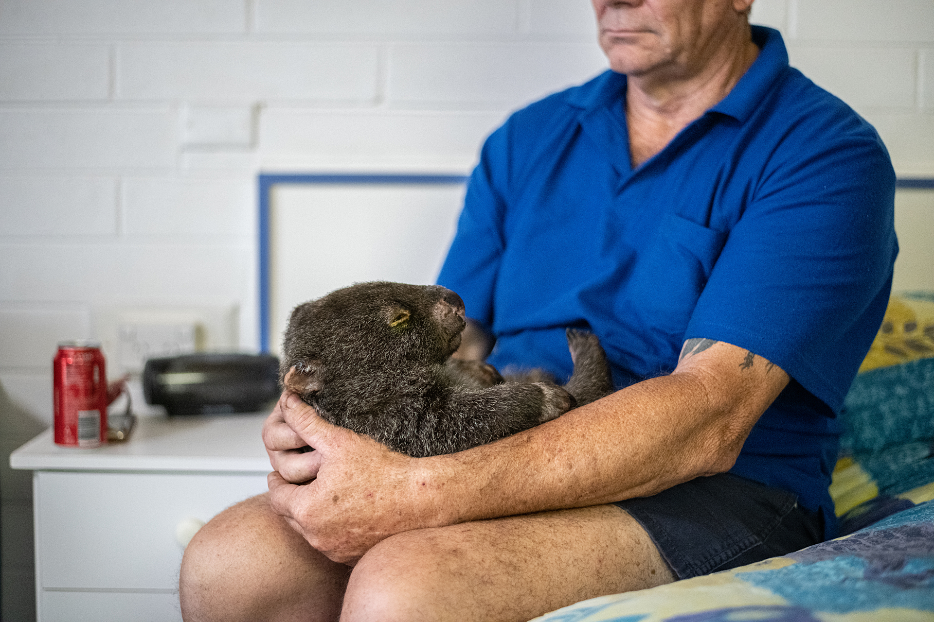 Southern Cross Wildlife Care's triage unit for burn victims sets up in a hotel room in Merimbula, New South Wales. This afternoon, the patients are wombats.