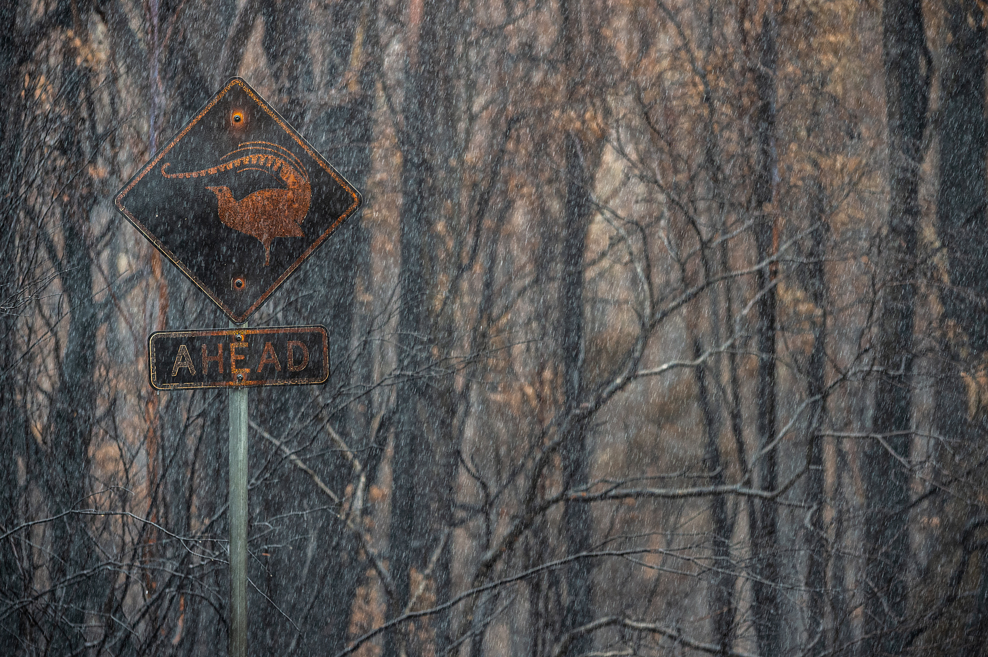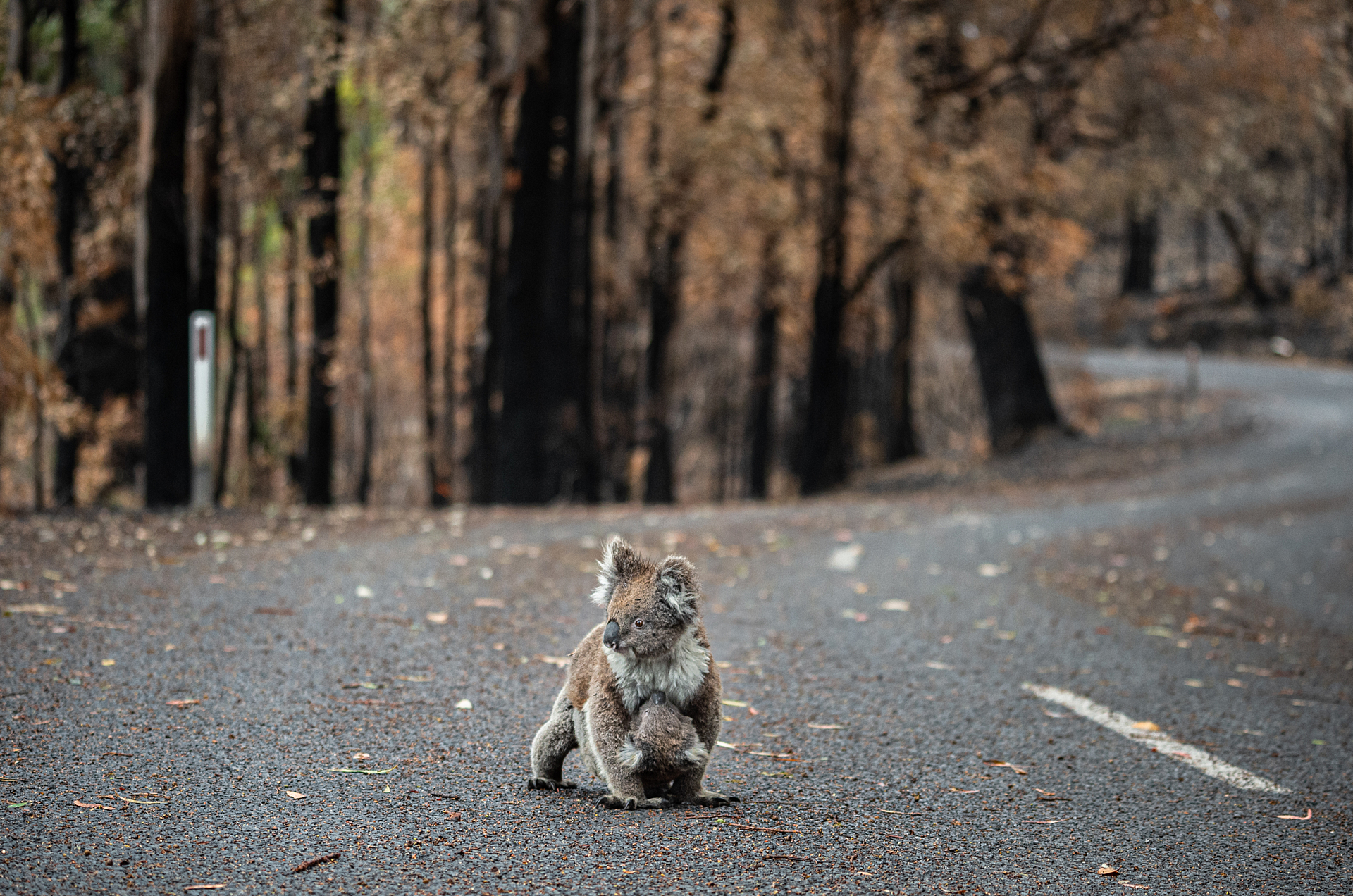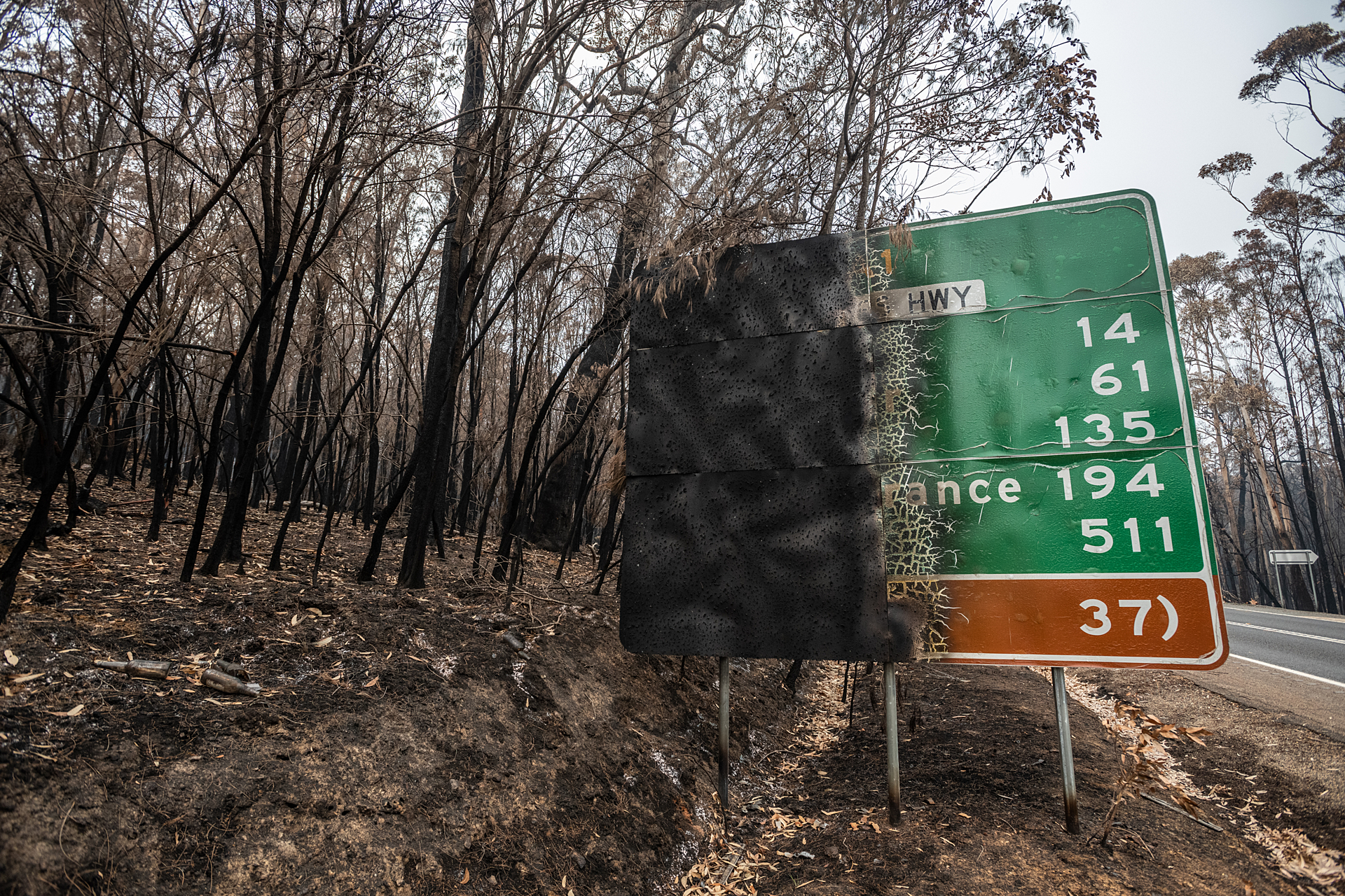 Burned forest and road sign in Mallacoota. This area was devastated by the fires one month ago, leaving much of the native wildlife suffering from traumatic injuries and at risk of starvation due to loss of habitat.