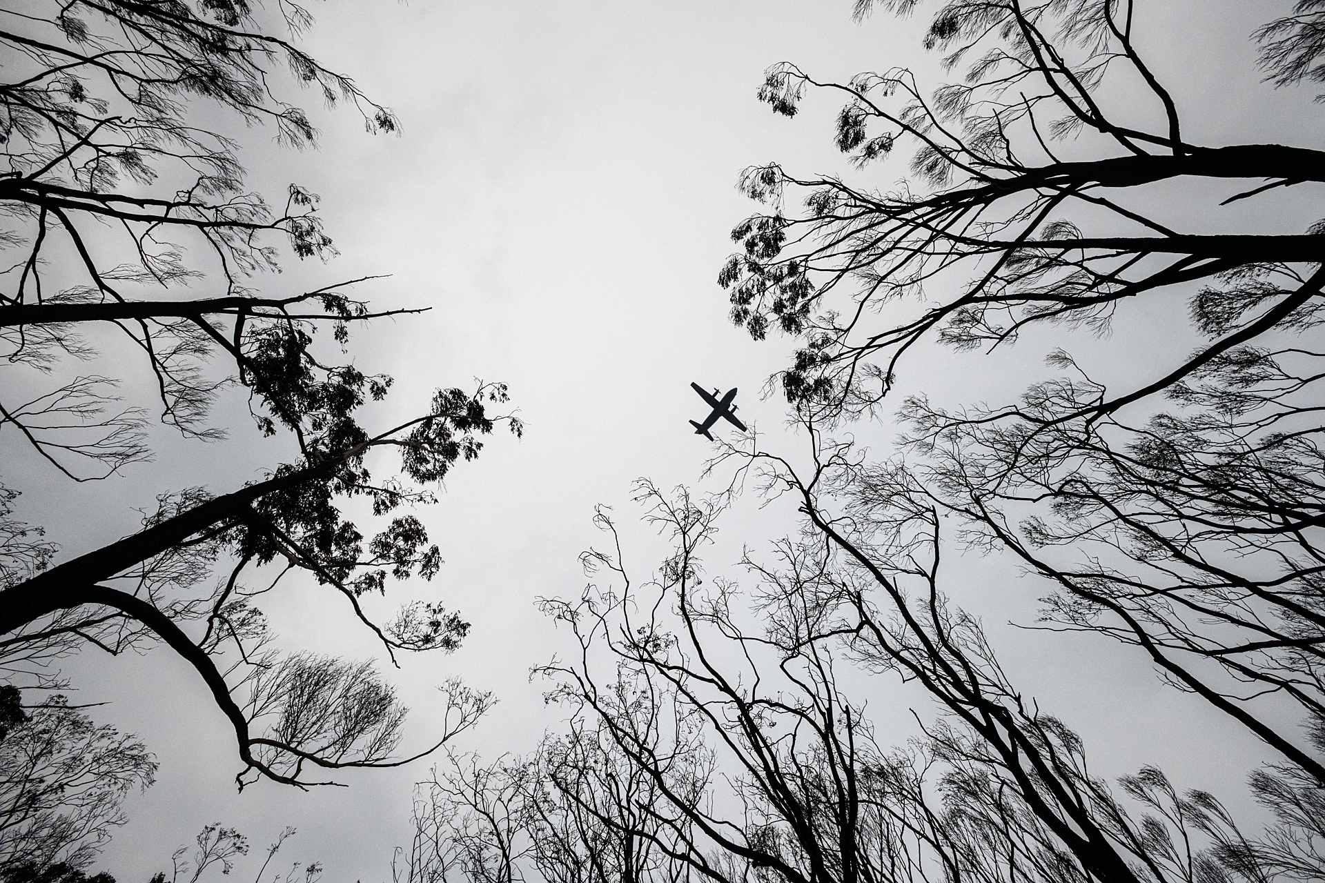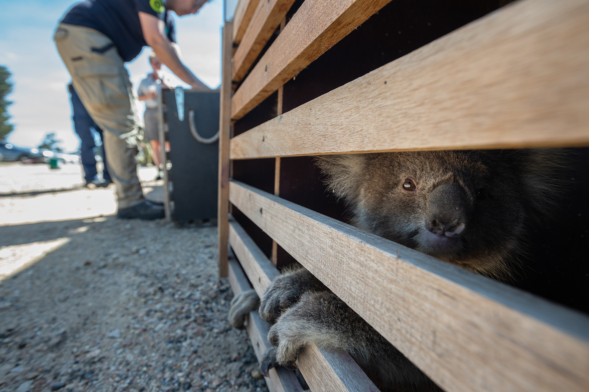 In the small community of Mallacoota, Victoria, the Department of Environment, Land, Water and Planning (DELWP) set up a triage site to take in and care for wildlife injured by the bushfires. Koalas that needed long-term rehabilitation were picked up at the triage center by the Royal Australian Airforce and brought to zoos in Melbourne. On this day, the ten koalas being transferred had been rescued from trees and burn sites by locals and Vets for Compassion.