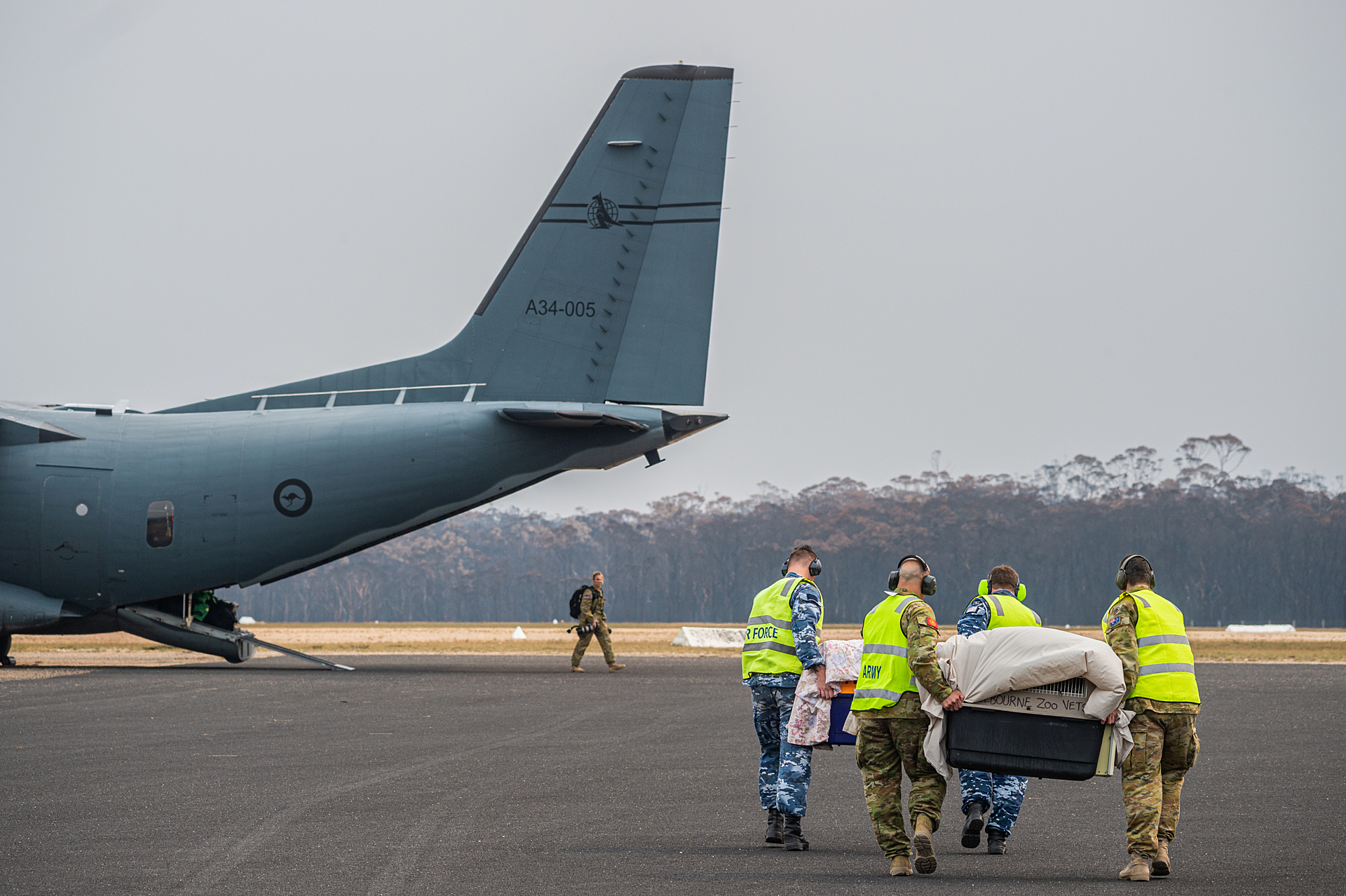 Ten rescued and stabilized koalas are delivered from Mallacoota to Melbourne by A Royal Australian Air Force plane. They will go for rehabilitation at zoos and sanctuaries and then be released into the wild with other koalas.