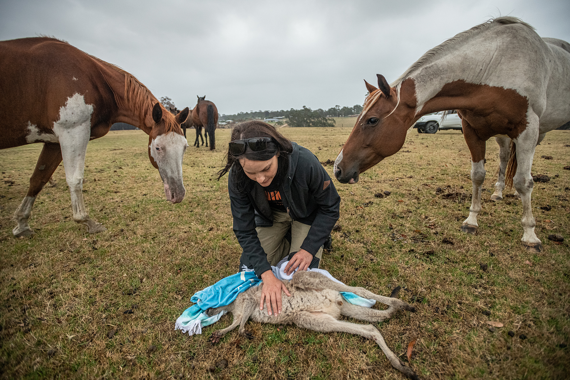 Louise Bonomi with a sedated joey who was injured by the bushfires. Curious horses in the pasture came over to investigate.