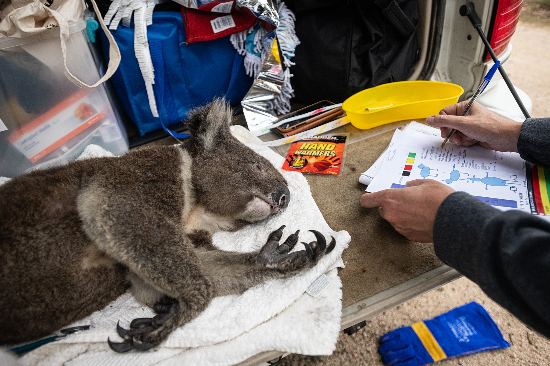 A skinny and dehydrated koala with burned paws, who has been sedated and captured is given immediate veterinary care in the field and sent to triage for recuperation and rehabilitation.