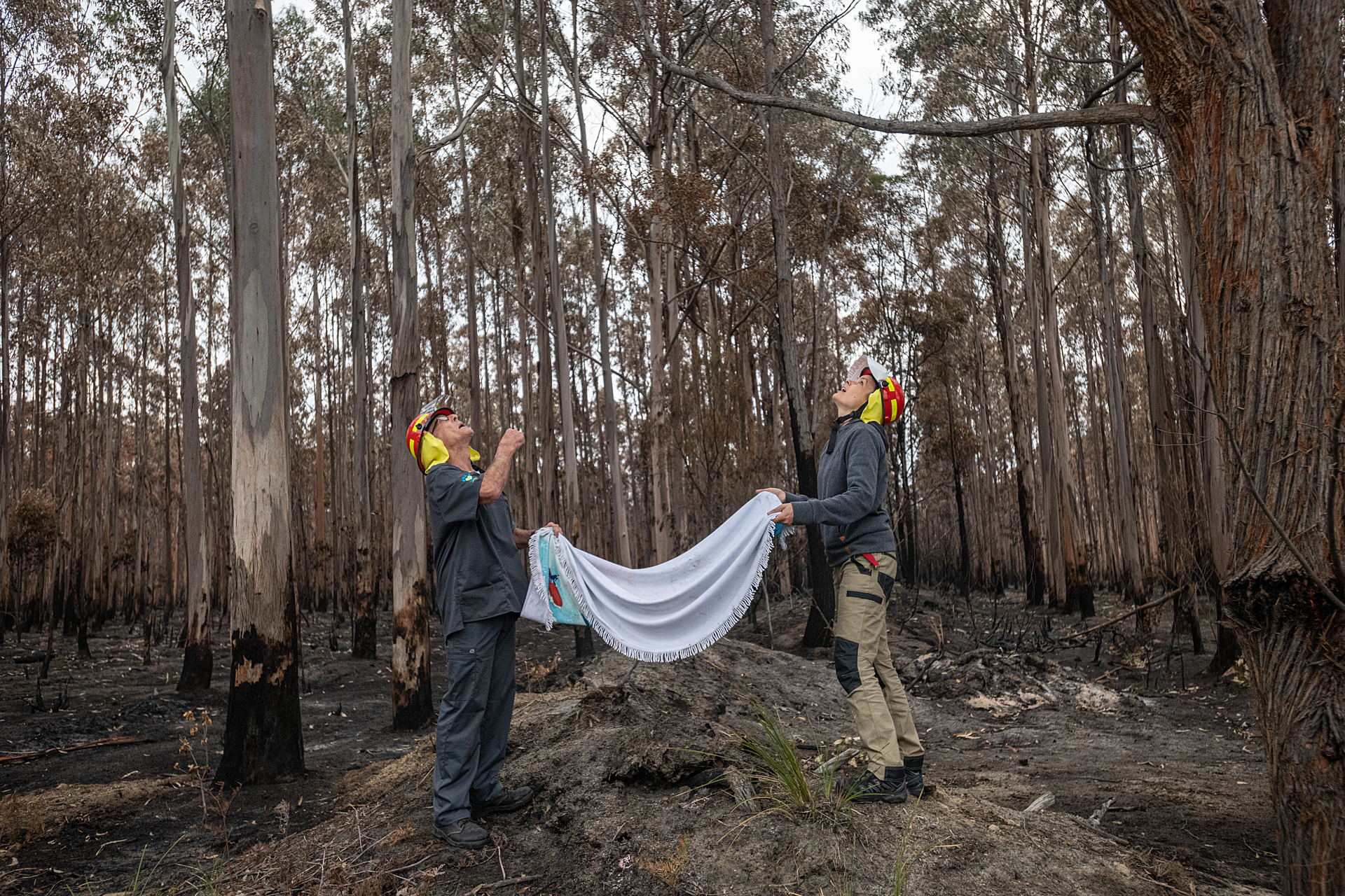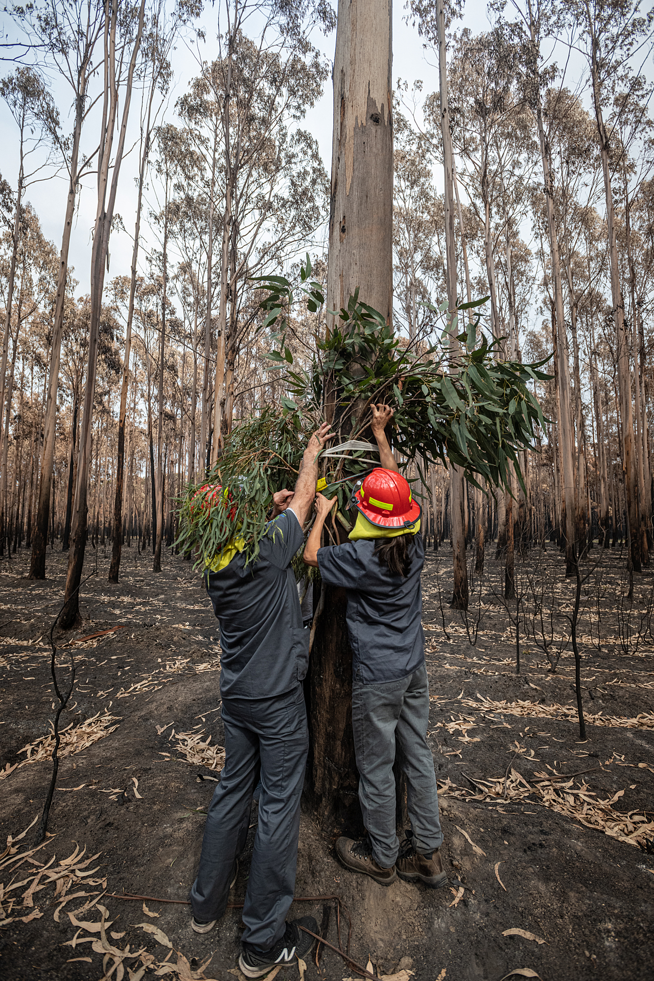 Dr. Elaine Ong and Dr. Chris Barton wrap fresh eucalyptus to a burned tree to entice and feed any remaining living koalas.