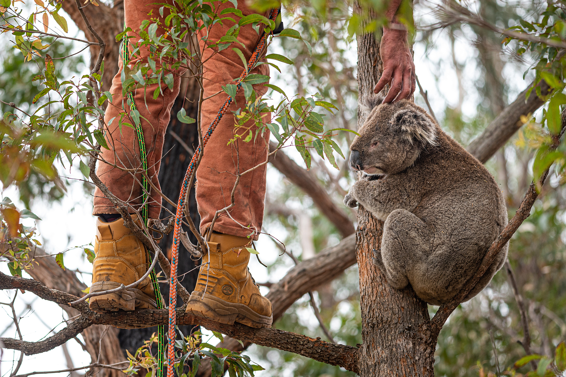 An arborist helping with animal rescues in Mallacoota gauges the sleepiness of a koala who has been darted with a sedation. The arborist helped bring the koala, who suffered from severe burns on his paws, down from the tree.